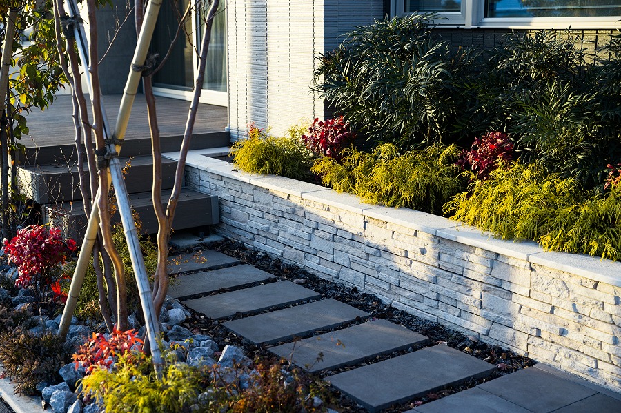 庭や玄関まわりに植物を取り入れ、住まい全体の景観を美しく整えます。植栽は見た目の彩りを豊かにするだけでなく、日差しを和らげることで室温の調整に役立ったり、一定の広さがあれば災害時の一時的な避難スペースとして活用できるなど、暮らしを支えるさまざまな役割を持っています。私たちは、敷地条件や周辺環境、ライフスタイルを踏まえながら、樹種の選定や配置計画を丁寧に行い、長く快適に楽しめる植栽をご提案しています。